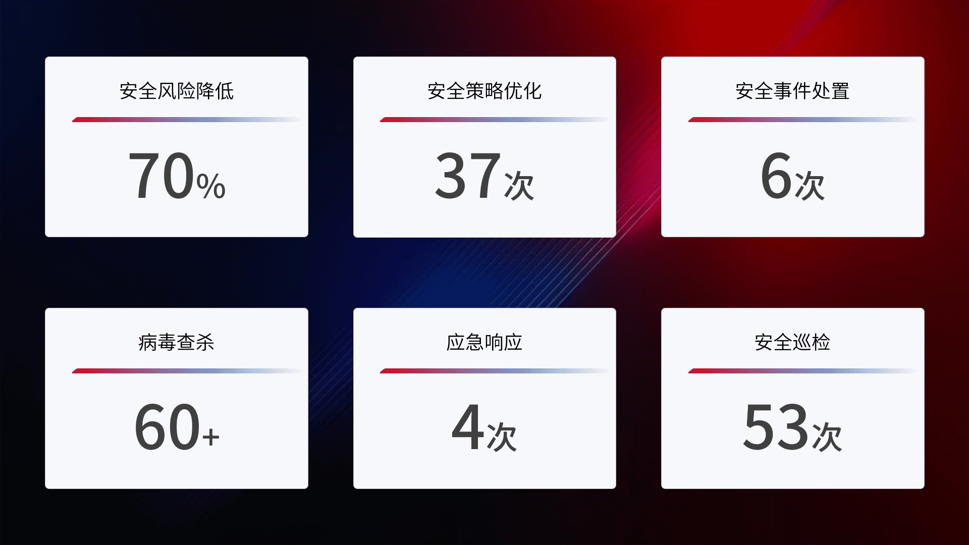 提供全面的安全事件报告体系,,,,包括处置报告、、周报、、、季度和年度总结,,,,结合持续监控,,帮助客户深入了解网络安全状况。。。