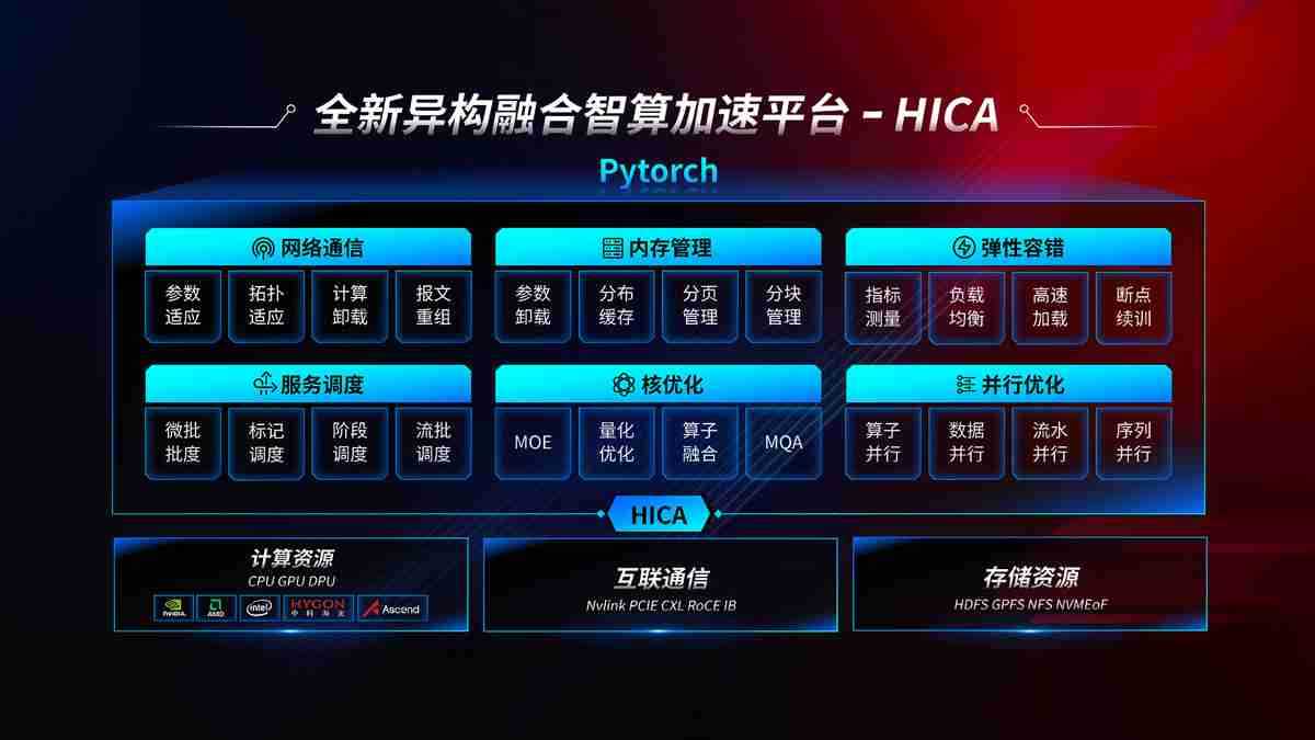 通过自研的服务层、、、、中间适配层、、、、以及调度编排算法,,,采用数据并行、、、、模型并行等多种并行方式,,,,把并行计算任务进行有效的分解,,,,使其分别由相应的软件栈和算力资源来承接。。。。当GPU资源变化,,,,HICA可以实时动态调度计算子任务并调整模型拓扑和架构,,以充分聚合各种算力资源。。