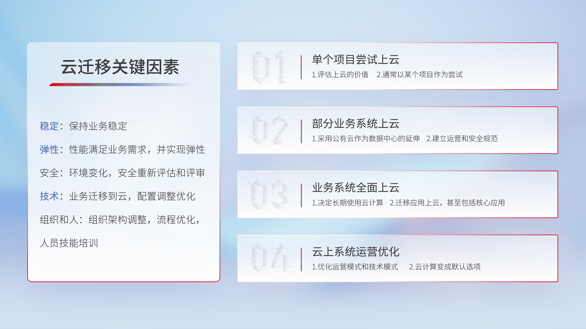 结合实际业务,,,,从规划设计、、云平台选型、、、、云原生改造、、、、数据迁移、、、、集成交付,,,,迁移全过程为客户识别最佳上云路径,,,做好风险识别管理,,设计网络架构、、、、身份权限、、安全审计合规、、、、操作审计、、、日志审计、、监控告警策略、、、多站点容灾设计等,,,,对云上基础设施进行整体规划,,,提升IT治理水平,,,,以满足弹性、、、高可用、、、、高性能的需求。。。