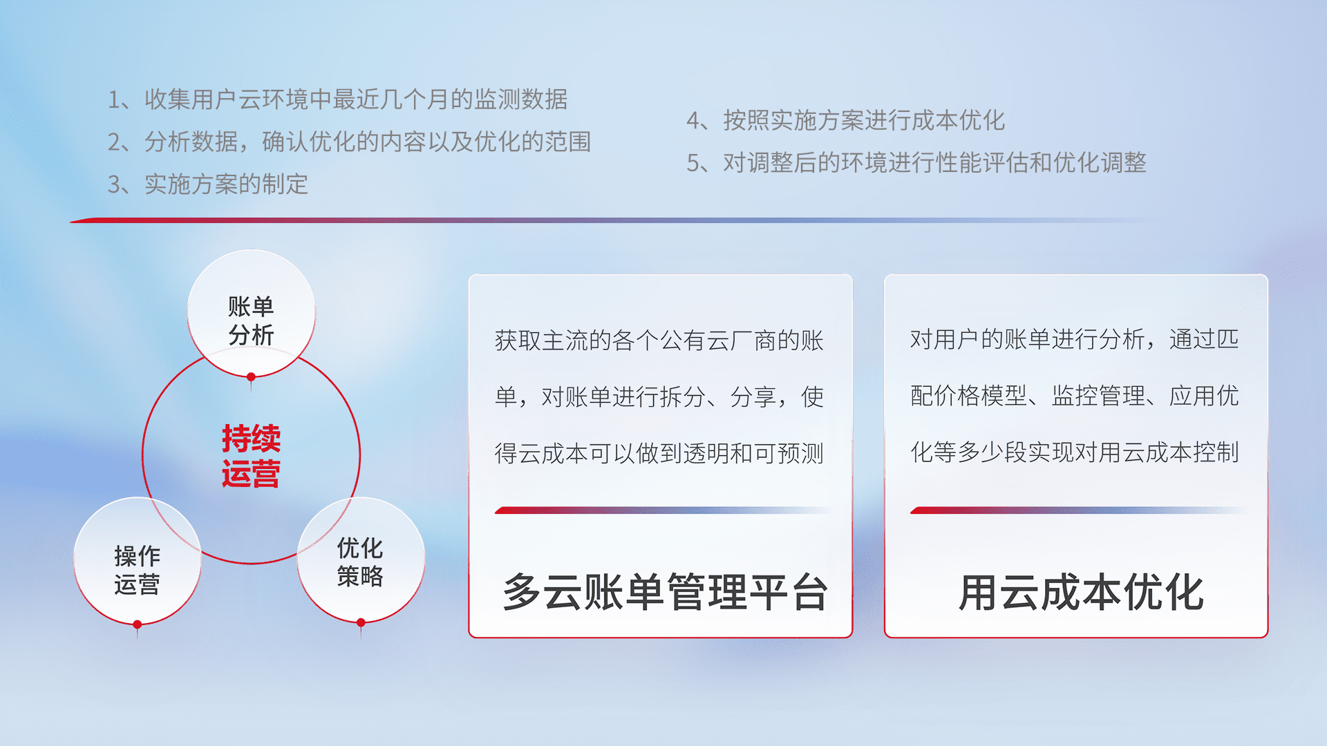 通过多云纳管,,以统一的资源数据模型把客户的云资源进行抽象和封装,,,进而实现对多云资源的统一操作,,,,保障云资源管理的可靠性、、、稳定性与可用性。。量身定制化运维内容,,,配置、、开发运维、、、补丁管理、、备份、、监控、、、、认证和访问管理、、、、审计和日常巡检等,,,,保障在用云过程中的可靠度,,稳定度以及高可用率。。。。