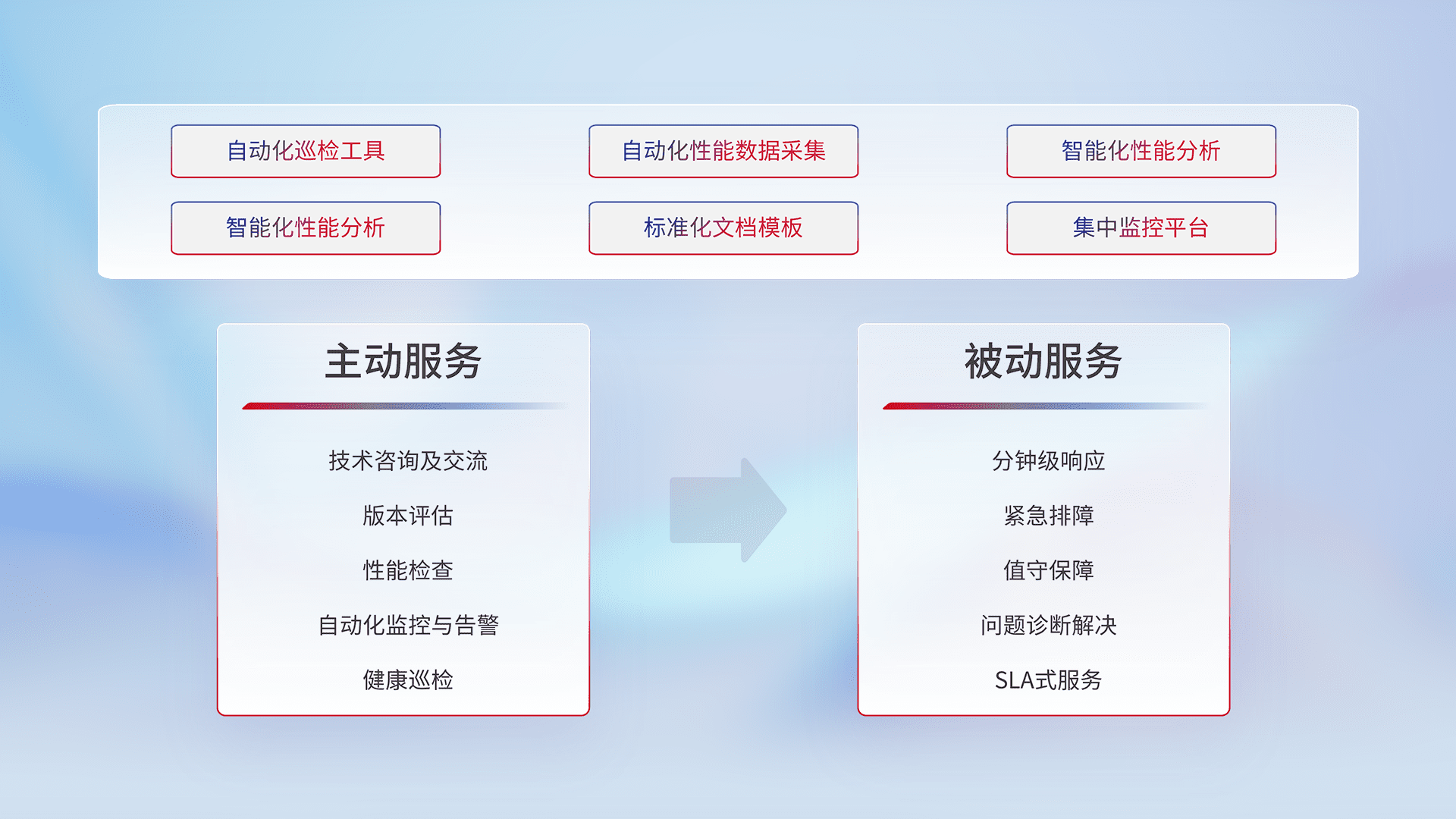智能化工具和标准化文档,,保障服务质量,,,提供主动服务(包含技术咨询、、版本评估、、性能检查、、、自动化监控与告警、、健康巡检)和被动服务包含(分钟级响应、、、紧急排障、、值守保障、、问题诊断解决、、、、SLA服务)。。